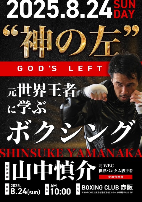 「神の左」山中慎介さんが、BOXINGCLUB赤坂に降臨! 8月24日(日)10:00〜、元WBC世界バンタム級王者・山中慎介氏による特別ボクシング教室を開催しま···
